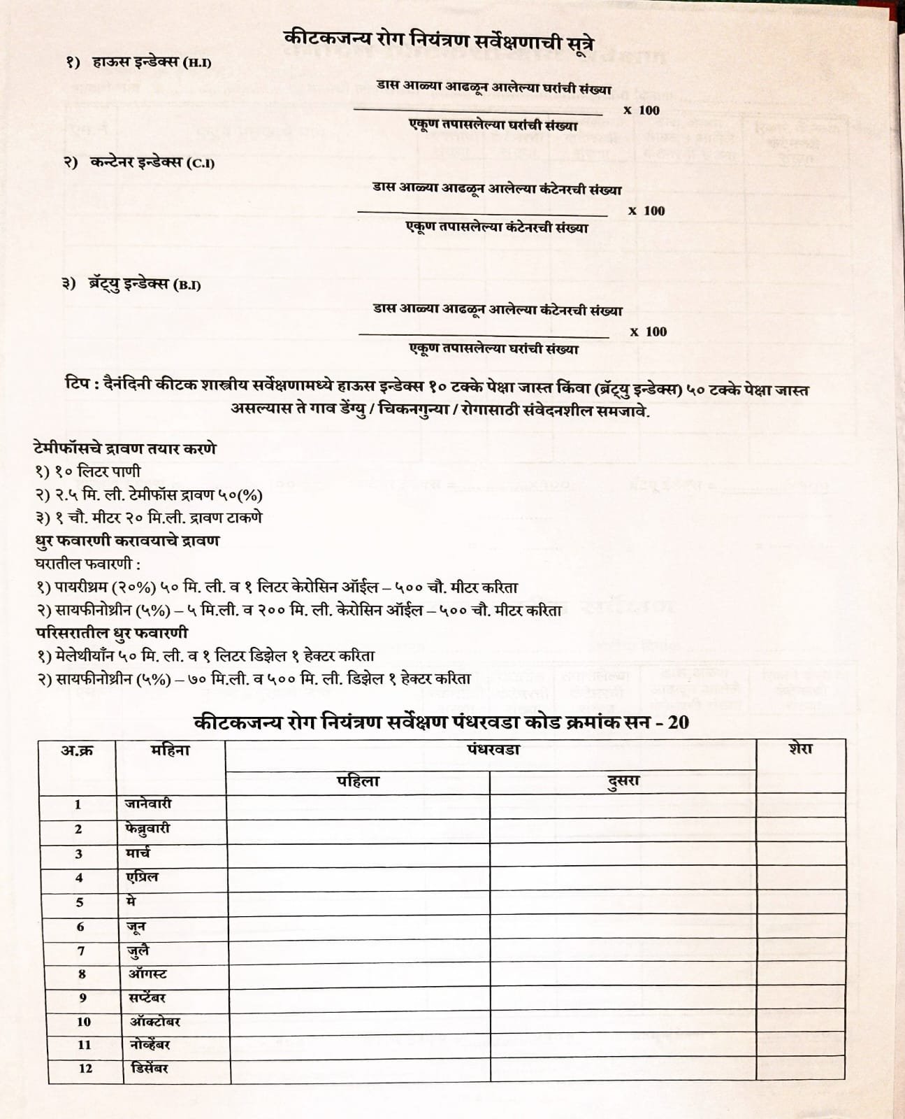 Container Survey Register रजिस्टरच्या पहिल्या पानावर कीटकजन्य रोग नियंत्रणासाठी आवश्यक असणारी महत्त्वाची सूत्रे दिलेली आहेत.