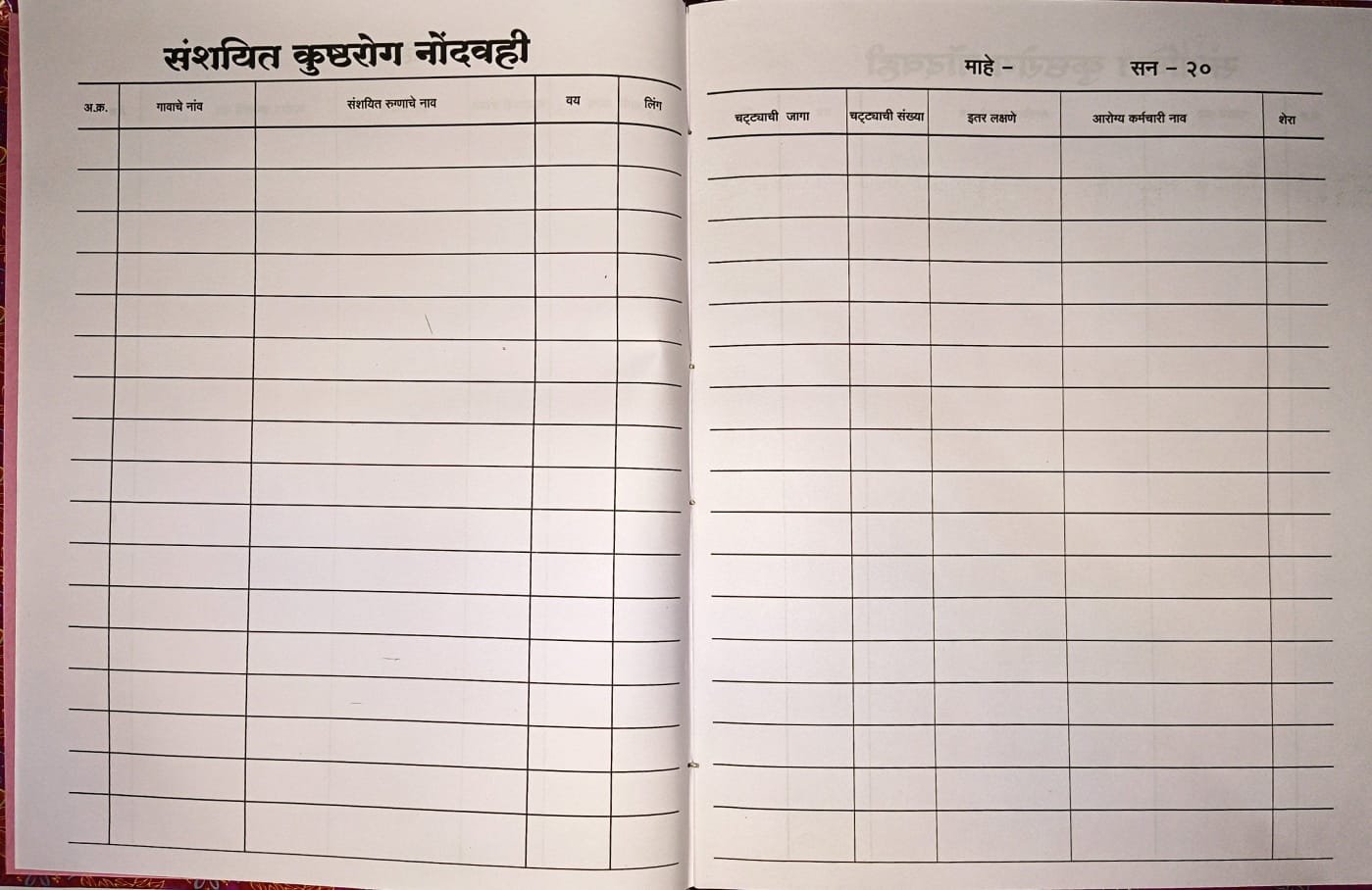 संशयित कुष्ठरुग्ण रजिस्टर, कुष्ठरोग नोंदवही, suspected leprosy register, आरोग्य विभाग रजिस्टर, आरोग्य सेवक नोंदवही, कुष्ठरोग नियंत्रण कार्यक्रम, health register in Marathi, leprosy case register, सरकारी आरोग्य नोंदवही, कुष्ठरोग माहिती फॉरमॅट